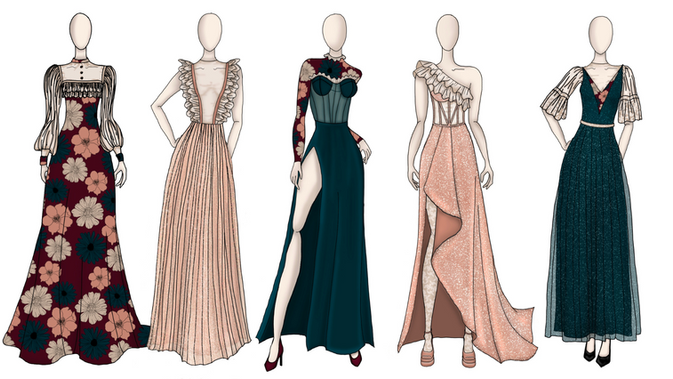 This fashion collection draws inspiration from the 1920s and the Art Deco movement, designed for confident, seductive, and strong women. It caters to middle to upper-class females who appreciate glamorous and elegant aesthetics. These women envision their ideal night out as a sophisticated gathering with fashion-loving and well-traveled friends at a stylish bar. The final designs evolved from initial loose sketches with overlaid patterns.